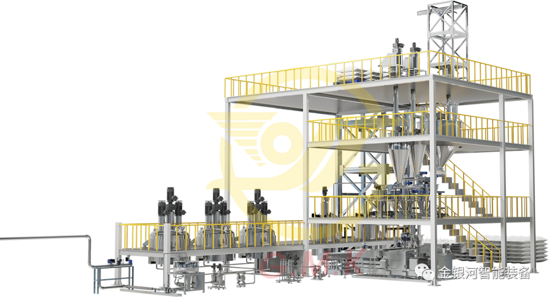 GMK3.0系列鋰電池正負(fù)極漿料雙螺桿連續(xù)法自動(dòng)生產(chǎn)線包含粉體計(jì)量輸送系統(tǒng),液體計(jì)量輸送系統(tǒng),雙螺桿螺旋混合系統(tǒng),漿料儲(chǔ)存輸送系統(tǒng),DCS中控控制系統(tǒng)。實(shí)現(xiàn)了漿料在狹小空間的強(qiáng)制性連續(xù)混合分散,混合次數(shù)可達(dá)到8-12萬(wàn)次,以極快的速度形成漿料。生產(chǎn)效率高,可達(dá)600-4500L/h漿料,實(shí)現(xiàn)產(chǎn)能1-10GWH;自動(dòng)化程度高,勞動(dòng)強(qiáng)度低,節(jié)省人力;與傳統(tǒng)攪拌生產(chǎn)比較,一年可節(jié)省約幾百萬(wàn)至上千萬(wàn)度電,節(jié)省能耗;生產(chǎn)的漿料分散混合效果好,固含量高,粘度穩(wěn)定,適合大規(guī)模鋰電池漿料的生產(chǎn)。